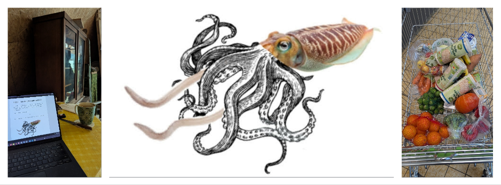 Der Zwölfte beginnt nachts, ich bin lange wach. Einen Teil der Zeit verbringe ich damit, Bilder von Tintenfischen herauszusuchen, denn ich möchte morgen (meint: heute nach dem Schlafen) den Beitrag von gestern mit einem gezeichneten Tintenfisch aufpeppen.
