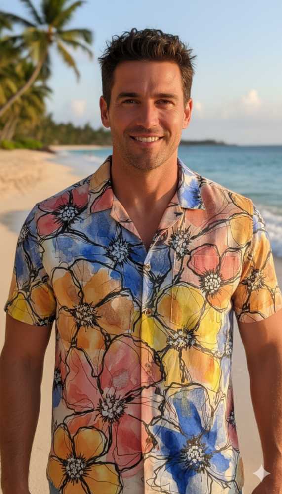 Ich habe eine Verwertungsidee, das ist ein typisches Hawaihemdmuster. Und damit Ihr Euch das besser vorstellen könnt, habe ich das einem KI-generierten Model angezogen.