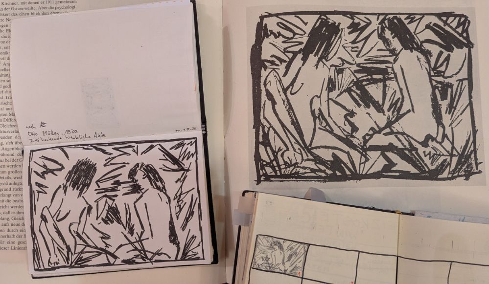 Rechts im Bild seht Ihr „Zwei hockende weibliche Akte“ von Otto Müller, links meine Kopie und von unten eingeschoben das Thumbnail. Die Original-Abbildung stammt aus einem Bildband zur Künstlergruppe „Die Brücke“, der auf meinem Esstisch liegt und in dem ich morgens gerade regelmäßig blättere. Und manchmal etwas daraus kopiere.