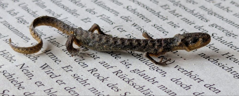 Dass in meinem Dome eine kleine Anzahl von Molchen überwintert hat, habe ich schon beschrieben. Die, die auf sich aufmerksam gemacht haben, wurden von mir auf ihrem Weg ins Wasser unterstützt. Aber mindesteten einer hat es nicht geschafft, zu sehen oben im Bild. Ich habe das ausgetrocknete Exemplar in Heizungsnähe gefunden, hielt es zunächst für einen weiteren Kandidaten, den zu retten meine Aufgabe sei. Im Zuge der beabsichtigten Rettung merkte ich schnell, dass er nicht mehr lebte. Ein echter Held, er starb mit erhobenem Kopf.