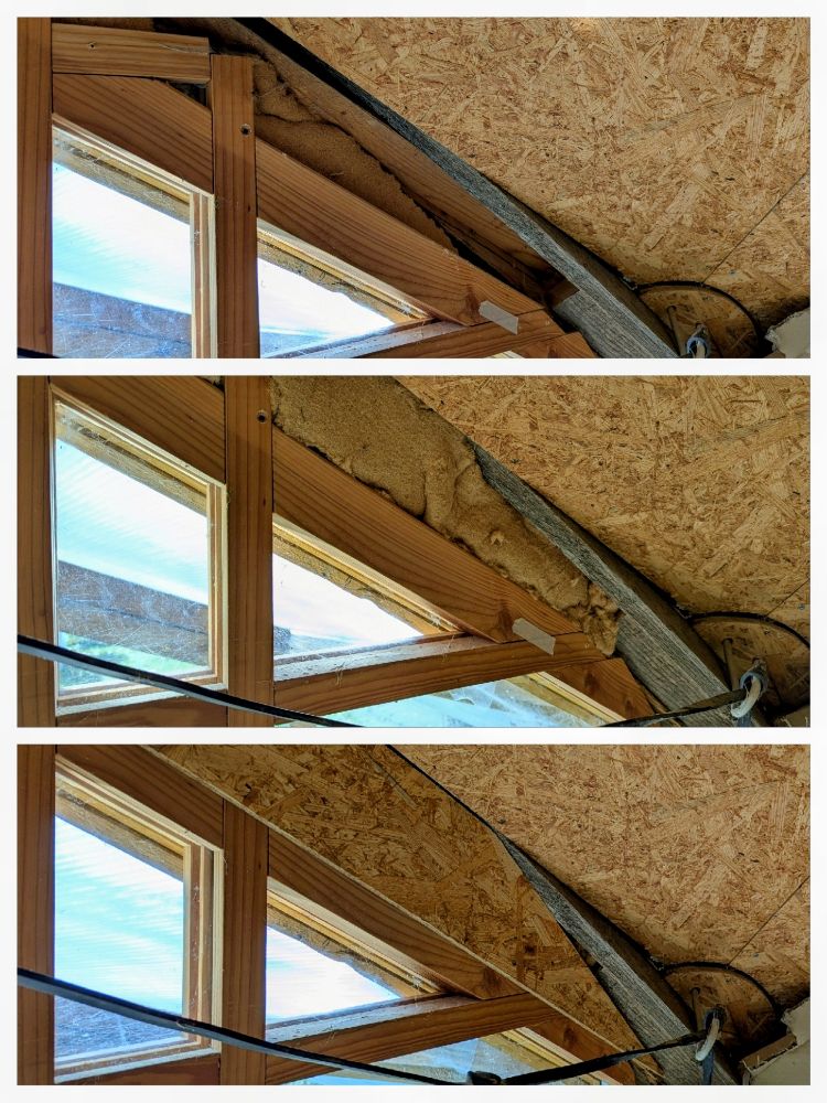 Vorgestern habe ich die noch fehlenden Verkleidungen für den oberen Abschluss der Fensterfront geschnitten und heute dann die erste davon angebracht. Vorher noch etwas nachgedämmt und nachgeschliffen, außerdem der unvermeidliche Kleinkram.