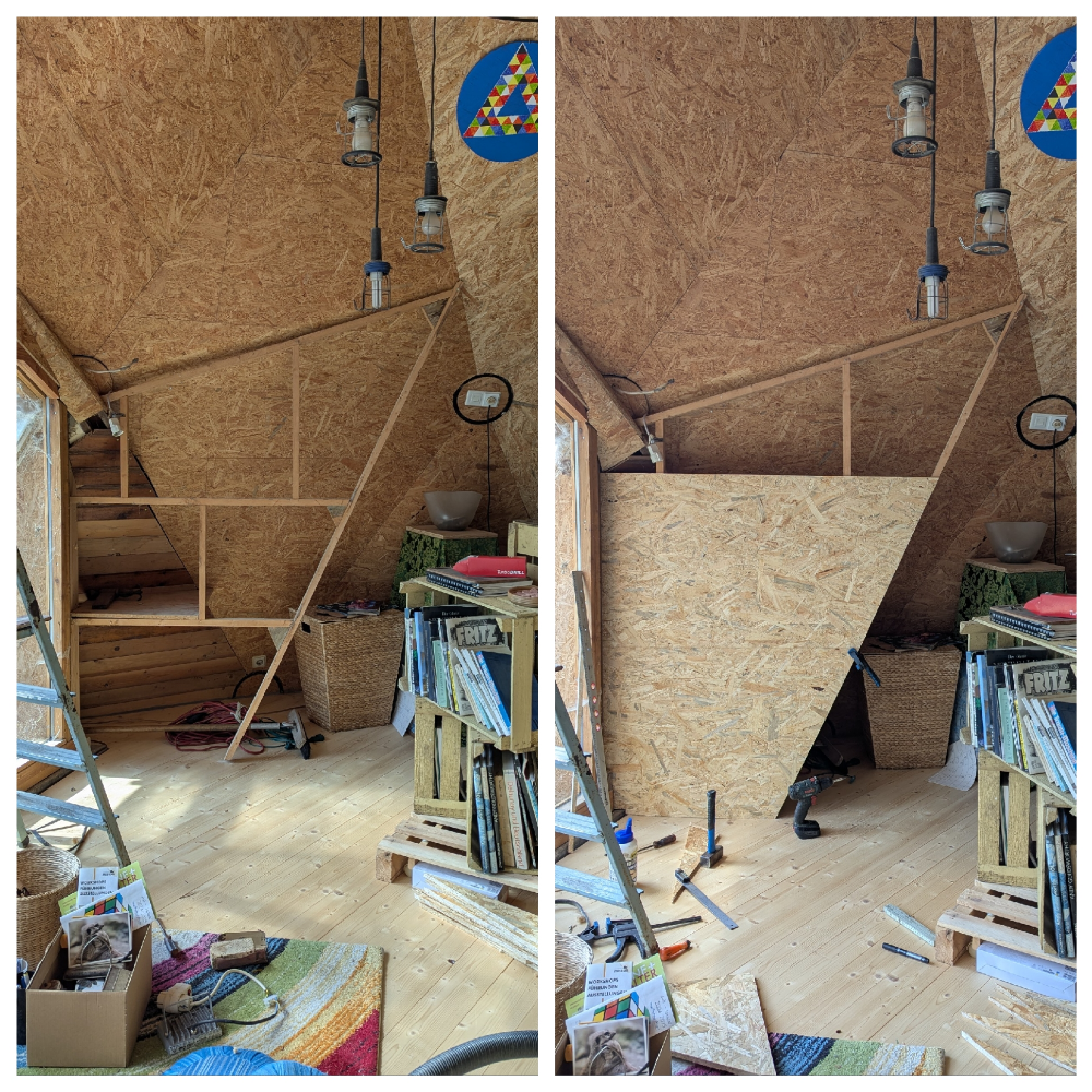 Auf den Bildern war es  in der Vergangenheit vielleicht nicht so auffällig, dass die Kammerwände nur aus Pappe bestehen. Ein (zu) gut funktionierendes Provisorium, um früh ein halbwegs ansprechendes Geschmacksmuster zu haben.