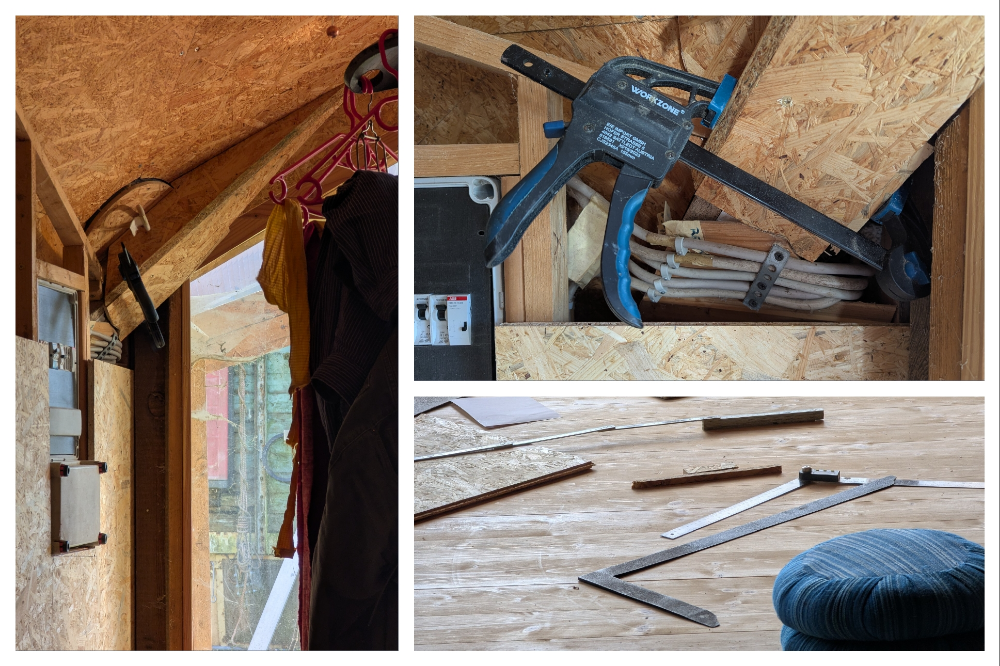 Naja, mensch soll nicht alles glauben, was mensch denkt. Manches ist einfach falsch, anderes stimmt nur die Hälfte der Zeit. Die Lust am Winkelschneiden zum Beispiel ist stark tagesformabhängig und verträgt sich schlecht mit irgendwelchen Ideen von Schnell-fertig-werden oder Das-soll-richtig-gut-werden. Kommt hinzu, dass der Grat zwischen Anregung und Überforderung schmal ist. Und, spätestens ab drei Winkeln, die nicht-rechtwinklig aufeinanderstoßen wird die Geschichte für mich zu komples, um sie „einfach“ abzumessen und zuzuschneiden. Da ist dann nur die schrittweise Annäherung möglich und ich laufe viel zwischen der Kreissäge und der Baustelle hin und her.