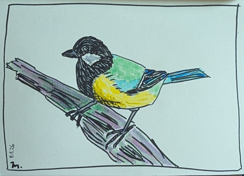 Oder besser: bei der Fotografie der Meise. Zugegeben auch das nur dann, wenn wir das Bild oben denn als Fotografie bezeichnen möchten, strenggenommen ist es eine fotorealistische Abbildung auf Grundlage einer Fotografie. Nichts darauf wurde fotografiert. Da darf mensch sich schon fragen, ob diese Abbildung in ein Tag einsortiert werden soll, das bisher nur Fotografien enthält. Eigentlich nicht. Andererseits würdet Ihr vermutlich überhaupt nicht darüber nachdenken, wenn ich diese Zeichnung mit #vögelbilder taggen würde.