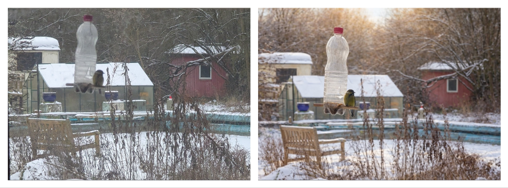 Womit wir endlich in der Grauzone angekommen sind, die den Anlass für diesen Beitrag bildete. Vorgestern habe ich unter „Mangels Meise“ das Bild einer Kohlmeise an meiner Futterstation gepostet, in das die Meise mittels Künstlicher Intelligenz eingefügt war. Vermutlich ist den meisten entgangen, dass dieser Beitrag nicht unter #vögelbilder abgelegt war, unter dem ich sonst die Bilder von Vögeln ablege. Es wäre mir falsch vorgekommen, ähnlich dem, auf dem Flohmarkt ein Löwenfell zu kaufen und es unter #meineSafari abzulegen.