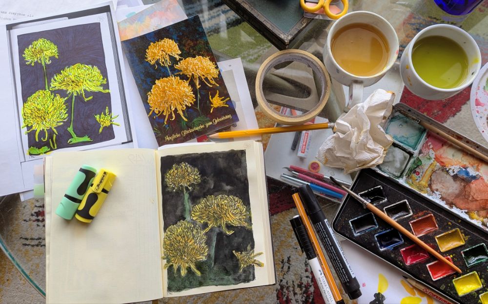 Rechts im Bild seht Ihr „Zwei hockende weibliche Akte“ von Otto Müller, links meine Kopie und von unten eingeschoben das Thumbnail. Die Original-Abbildung stammt aus einem Bildband zur Künstlergruppe „Die Brücke“, der auf meinem Esstisch liegt und in dem ich morgens gerade regelmäßig blättere. Und manchmal etwas daraus kopiere.