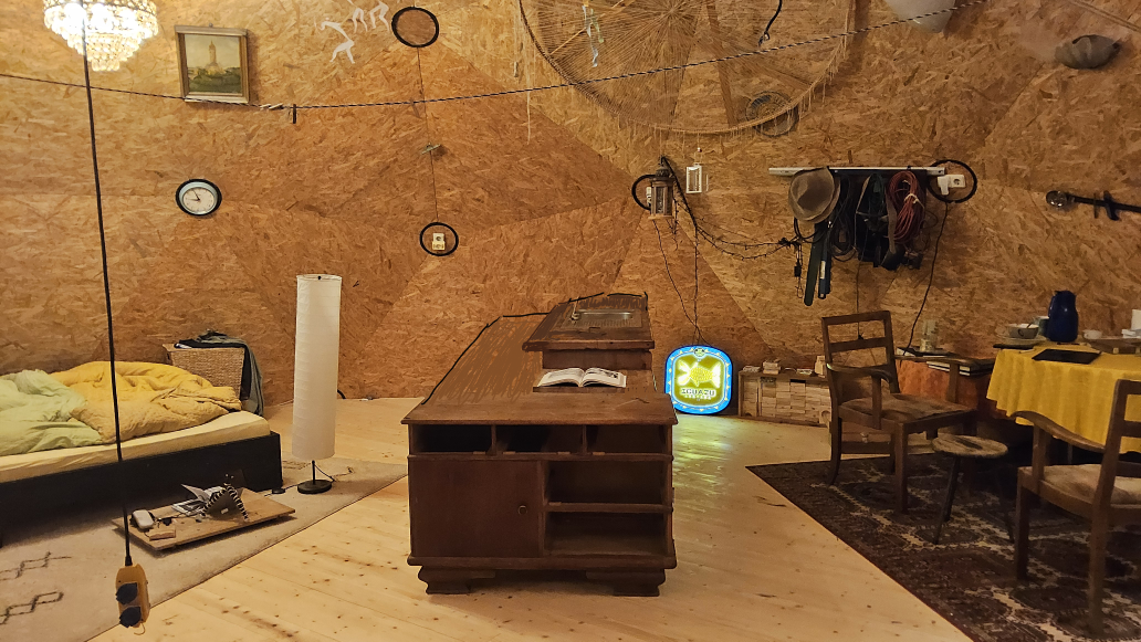 Und diese Zufriedenheit war keineswegs vorherzusehen. Die Idee, die Küchenzeile in die Mitte des Domes zu stellen, war hochgradig experimentell. Zwar war sie in meinen ersten Einrichtungsideen an einer ähnlichen Stelle (die durch die Lage des Abflusses grob vorherbestimmt ist), aber durch eine Stellwand verdeckt. Die Stellwand habe ich verworfen, stattdessen wird die ganze Geschichte zu einer Kücheninsel gepimpt. Im Foto habe ich etwas herumgemalt, um einen ersten Eindruck zu vermitteln. Stellt Euch das Ganze mit neuen einheitlichen (vermutlich helleren) Arbeitsflächen vor, im niedrigen von rechts erreichbaren Teil, noch zwei Gasflammen zum Kochen, ganz hinten an der Wand Mikrowelle und Airfryer. Die linke Seite besteht im unteren Bereich aus zwei Apothekerschränken, im Wesentlichen also aus Schubladen, die all meinen Kleinkram aufnehmen sollen. So zu reduzieren, dass das gelingt, wird eine ganz eigene Aufgabe.
