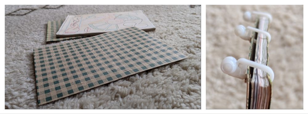 Eines der Deckblätter ist noch nicht in das dazugehörige Umschlagpapier eingeschlagen und, ich erinnerte mich langsam wieder, aus irgendeinem Grund fehlte damals schon die Spirale des Spiralblocks. Es gab die Idee, sie mit Kupferdraht nachzubilden, fällt mir ein. Irgendwann ist dann wohl miteinander vergessen gegangen.