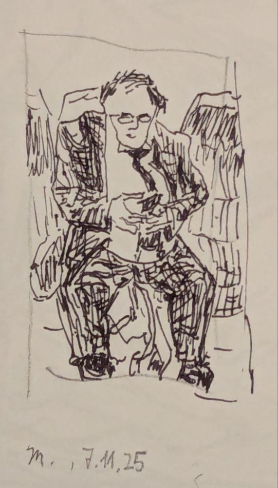 Manchmal fallen mir Menschen auf, von denen ich denke, dass sie ein Bild wert sind. Dieser Mann saß mir auf dem Nachhauseweg von Dublin in der S-Bahn gegenüber und ich konnte es mir nicht verkneifen, ein heimliches Foto von ihm zu machen. Umgesetzt dann als Scribble am 7.11.25 im Krankenhaus, eigentlich wollte ich noch eine größere Version davon zeichnen, das wird nicht mehr geschehen.