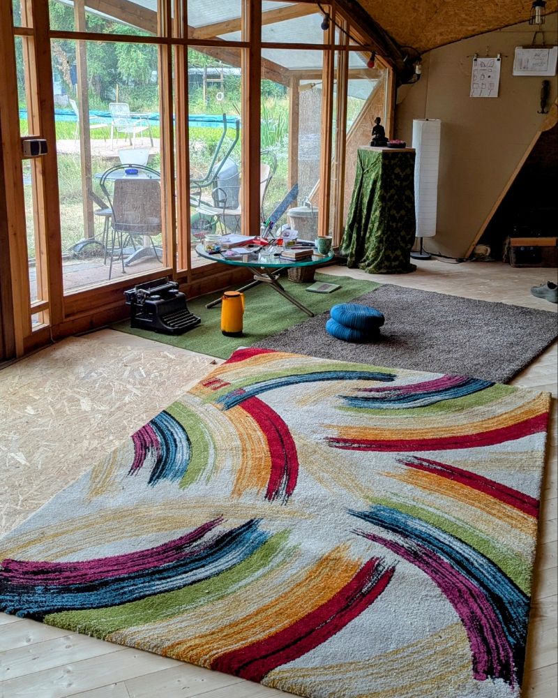 Im Vordergrund ein neuer alter Teppich. Im Moment bin noch recht wahllos, was Teppiche betrifft, denn sie dienen in erster Linie dazu, den noch unbehandelten Boden zu schonen. Und so ist es auch schon klar, dass die beiden Exemplare im Bildhintergrund (grün und braun) nicht bleiben werden. Bei dem bunten Teppich mit dem Pinselstrich-Design bin ich mir noch unsicher. Ich entdecke gerade bei mir eine neue Vorliebe für (sehr) farbige Dinge. Und da würde der schon gut passen.