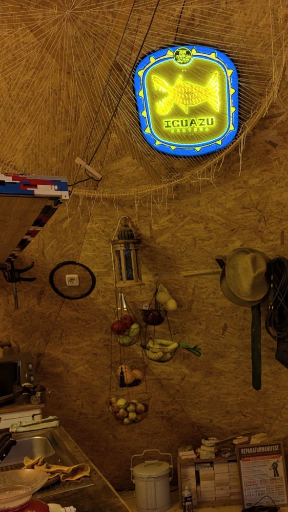 Ist immer wieder interessant, wie lange es sich hinziehen kann, eine eigentlich sehr übersichtliche Aufgabe zu erledigen. Heute das Aufhängen des Thekenschilds. Rundwebrahmen ab und wieder dran, die dabei mitbetroffenen Webproben an anderer Stelle aufgehängt. Weil die benachbarte Lampe nicht mehr passt, muss die auch ab und an anderer Stelle wieder dran. Zwischendrin – und mit der Aufgabenstellung vollkommen unverbunden – endlich den lose herumliegenden gelben Sack gegen den vorhandenen Mülleimer getauscht. Dabei im Mülleimer ehemals weggeworfene Stoffstreifen entdeckt und sie zur späteren, gegenwärtig aber noch unbekannten, Verwendung zu einem Zopf geflochten. So vergeht die Zeit …