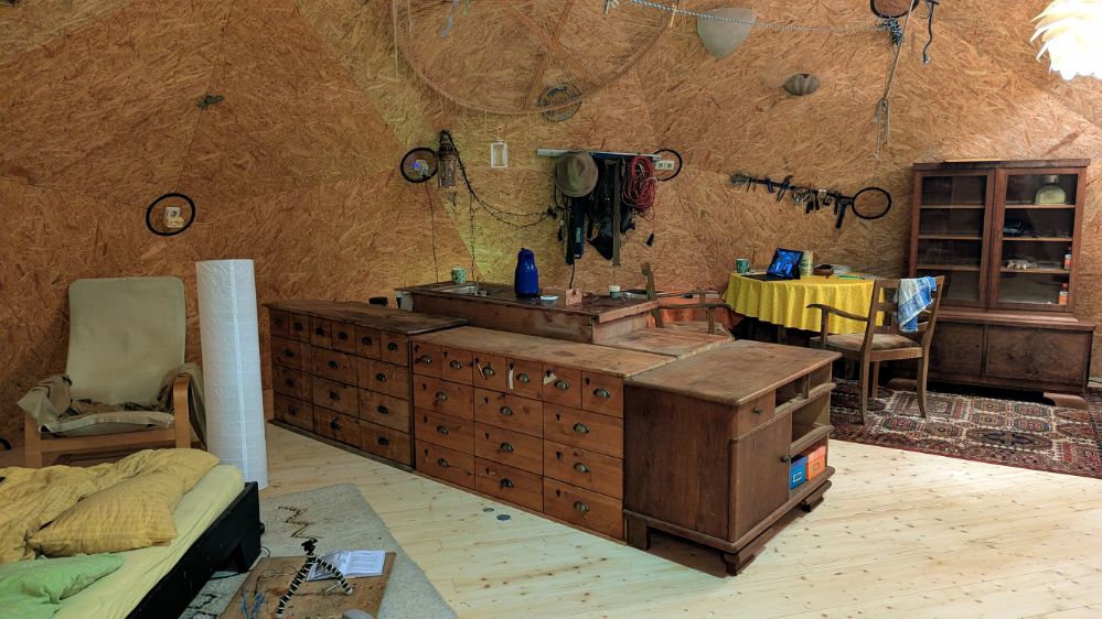 Von einem Entwurf spreche ich, weil noch nichts so ist, wie es bleiben wird. Alle Behältnisse stehen an den Stellen, wo sie die nächsten Jahre stehen werden, aber jedes einzelne Stück wird noch Gegenstand weiterer, nun, nennen wir es Aufwertung. Hinter Vitrine und Kleiderschrank ist viel Stellraum, den ich (möglicherweise mit daran angepassten Regalen) nutzen möchte. Die Zeugs und Kücheninsel bekommt durchgängige Arbeitsplatten auf jeder ihrer Ebenen, dazu müssen kleine Höhenunterschiede ausgeglichen werden. Bedeutet, dass ich die Anordnung nur sehr eingeschränkt nutzen oder einräumen kann, weil alles beweglich, kippbar oder wenigstens vibrationsunempfindlich bleiben muss, solange es nicht fertig (genug) ist. Auch wenn es immer weniger so aussieht lebe ich auf einer Baustelle.