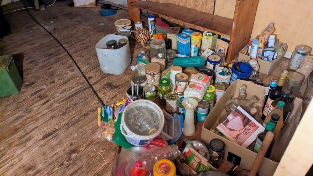 Von einem Entwurf spreche ich, weil noch nichts so ist, wie es bleiben wird. Alle Behältnisse stehen an den Stellen, wo sie die nächsten Jahre stehen werden, aber jedes einzelne Stück wird noch Gegenstand weiterer, nun, nennen wir es Aufwertung. Hinter Vitrine und Kleiderschrank ist viel Stellraum, den ich (möglicherweise mit daran angepassten Regalen) nutzen möchte. Die Zeugs und Kücheninsel bekommt durchgängige Arbeitsplatten auf jeder ihrer Ebenen, dazu müssen kleine Höhenunterschiede ausgeglichen werden. Bedeutet, dass ich die Anordnung nur sehr eingeschränkt nutzen oder einräumen kann, weil alles beweglich, kippbar oder wenigstens vibrationsunempfindlich bleiben muss, solange es nicht fertig (genug) ist. Auch wenn es immer weniger so aussieht lebe ich auf einer Baustelle.