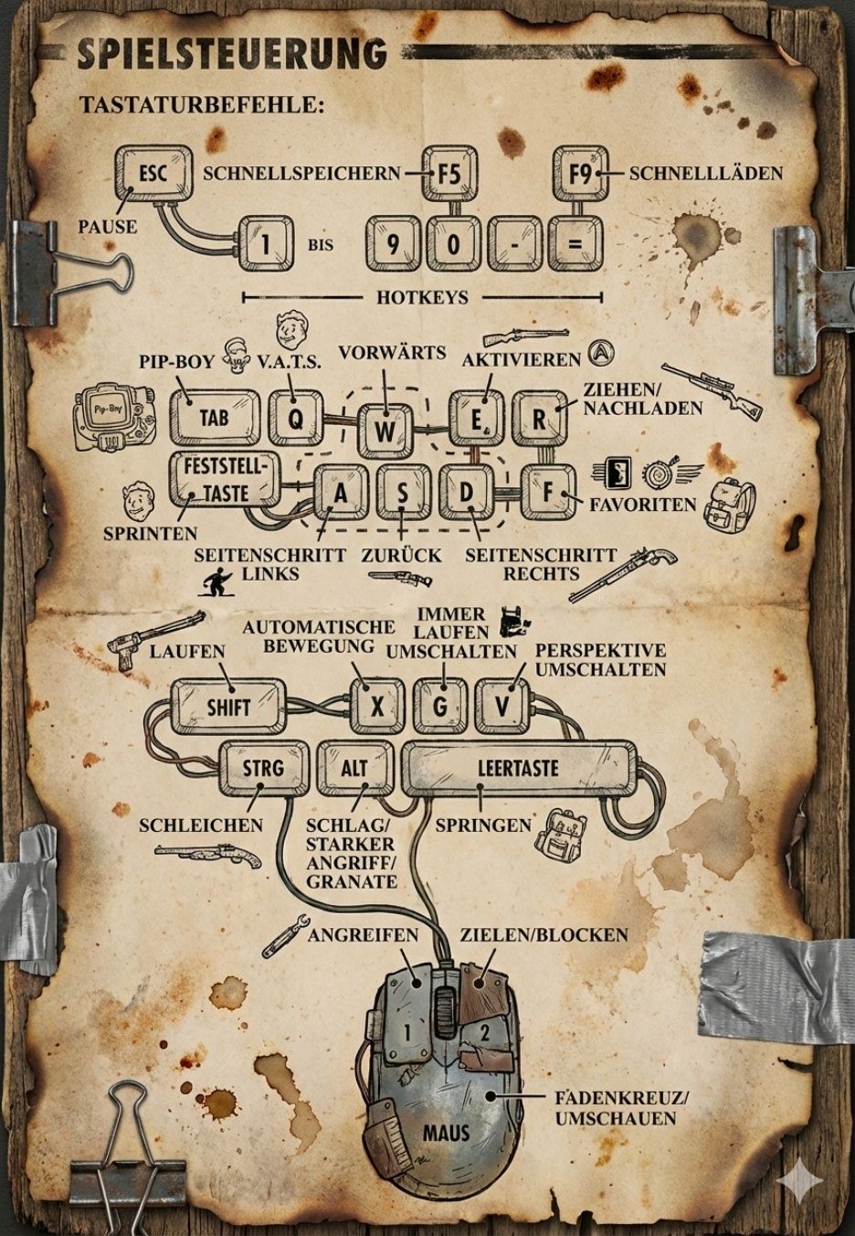 TAB gedrückt halten – Taschenlampe am Pip-Boy an/aus (lebenswichtig in Ruinen!).