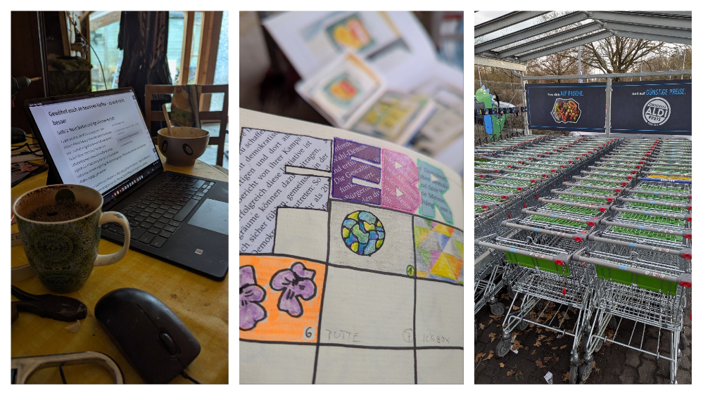 Ab jetzt kann ich das mit dem Rückwärtserzählen nicht mehr abbilden, weil ich vorher ja nicht wußte, dass ich das wollen würde. Es gab also eine Zeit im Tag – zwischen Frühstück und Aufräumaktion – da habe ich kleinere Eintragungen in meinem Sketchbuch gemacht oder war einkaufen.