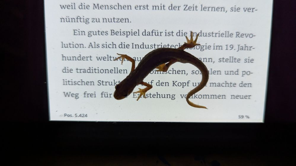 Gestern und vorgestern hatte ich jeweils nächtliche Begegnungen mit Molchen. Und zwar im Dome. Ich lese zum Einschlafen, der Reader liegt vor mir auf dem Boden, ich schaue aus dem Bett auf ihn herab. Anscheinend fühlen sich die Tierchen vom Licht angezogen. Kein Problem damit, ich helfe ihnen freundlich ins Freie und gut ist es.